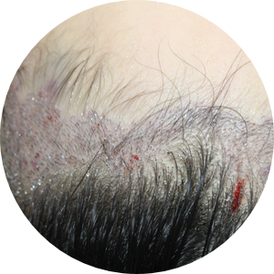 A result of the transplantation, where follicles were grafted using the slit and forceps technique, avoiding existing baby hairs (vellus hair), with a gradient in thickness from fine to thicker hairs.