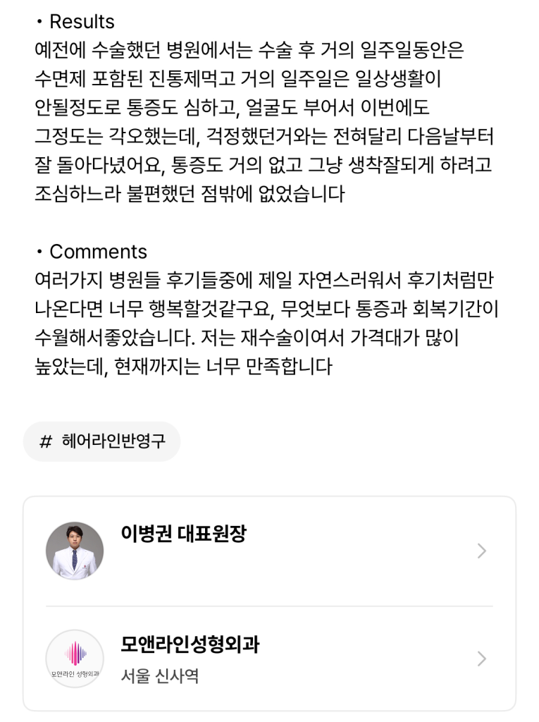 This review was personally shared on GangnamUnni by a female patient (머리마리머히) who visited us from Canada.
