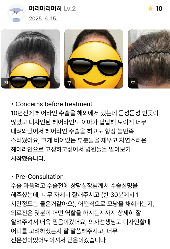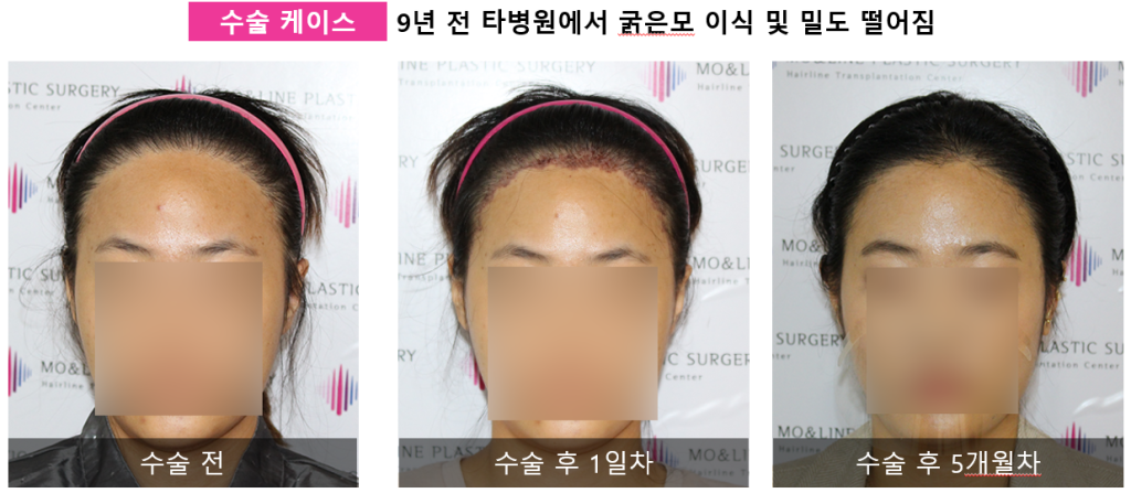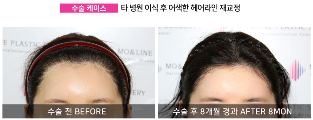 Hello ! this is Mo&Line Plastic Surgery, located in Sinsa Station, Seoul, where we focus on delivering top-quality hairline results. The patient in this case had a traumatic forehead scar and previously underwent a hair transplant in Canada about 10 years ago.