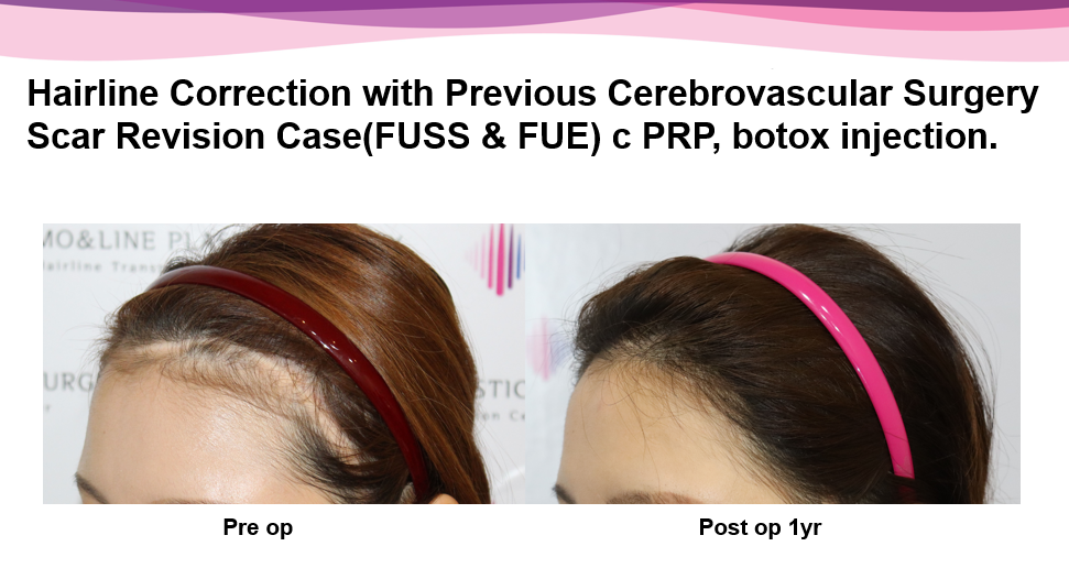 20s female patient with visible scar, high forehead, and M-shaped hairline following brain vessel surgery